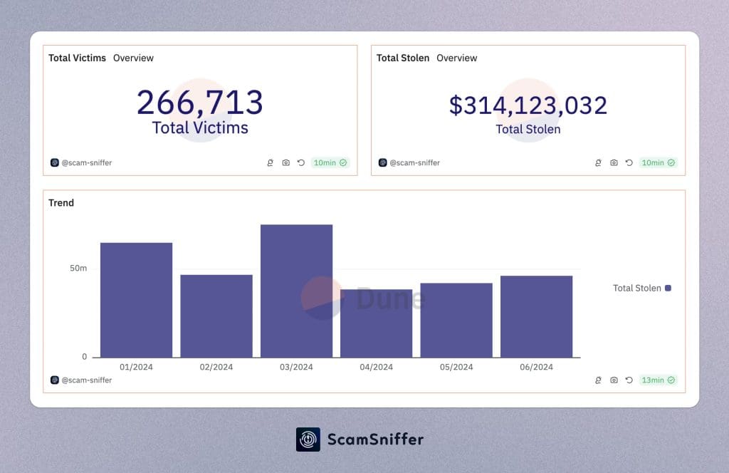 According to recent data from blockchain research firm Scam Sniffer, phishing scammers stole about $314 million worth of cryptocurrency in just six months, marking a 6.44% increase compared to the same period in 2023.