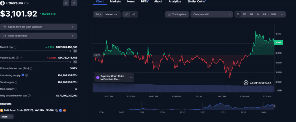 Meanwhile, the global crypto market has recorded healthy gains in the last 24 hours and Ethereum is not left out. According to CoinMarketCap data, ETH has added 0.95% to its value over the previous 24 hours. At the time of writing, ETH is trading at $3,101. However, its one-day trading volume tells a different story as it has declined by 29.81% to $14.7 billion with a live market cap of $372.8 billion.