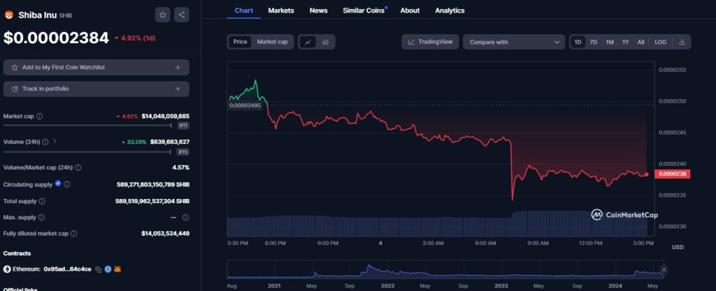 The price of SHIB has taken a nosedive in the last 24 hours. According to data provided by CoinMarketCap, SHIB has declined by 5.03% to trade at $0.00002382. However, its trading volume over this period has jumped by 33% to $639.8 million.