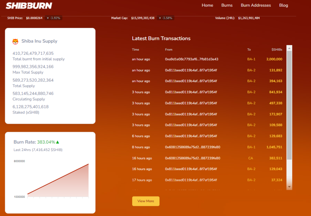 Shibburn, a dedicated Shiba Inu burn tracker platform, paints a clear picture of the Shiba Inu burn activity over the last 24 hours. According to the data, about 7,416,452 tokens (7.4 million) have been removed from circulation, consequently increasing the burn rate by exactly 383%. The above-mentioned amount of SHIB was destroyed across 18 transactions.