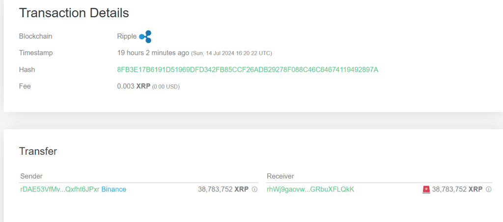 According to the report, the whale first moved a staggering 38,783,752 XRP, valued at $20.4 million, from the aforementioned exchange giant to a wallet address initially labeled ‘unknown’ by the tracker.