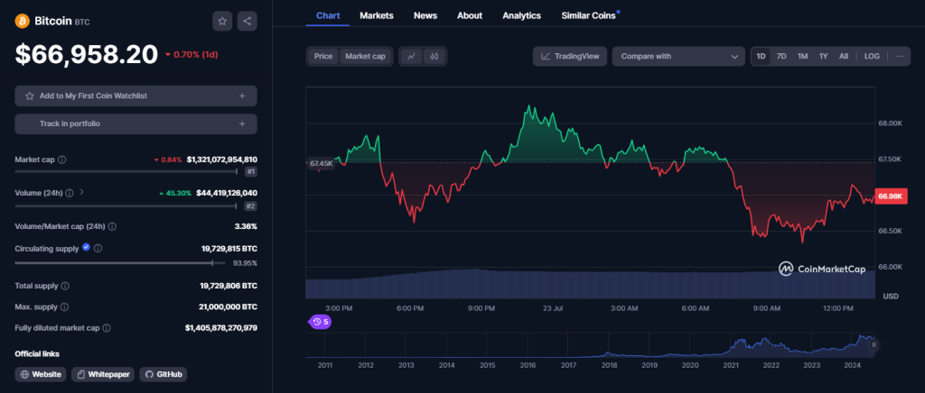 Following the $4 million BTC move made by the Mt. Gox exchange today to repay its creditors, Bitcoin fell to the daily low of $66.2k. The price of BTC has hovered between $66,267.87 and $68,272 respectively. However, at press time, the coin is $66,958, signaling a 0.70% decline. Interestingly, Bitcoin ETF’s total daily net inflow reached $533.57 million according to Soso Value data.