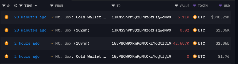 Shortly after, the exchange transferred another 5.11k BTC, worth $340.29 million to another internal wallet identified as ‘1JKM…eMVX.’ The timing and manner of these transfers suggest that Mt. Gox creditors may be receiving their remaining payments today.