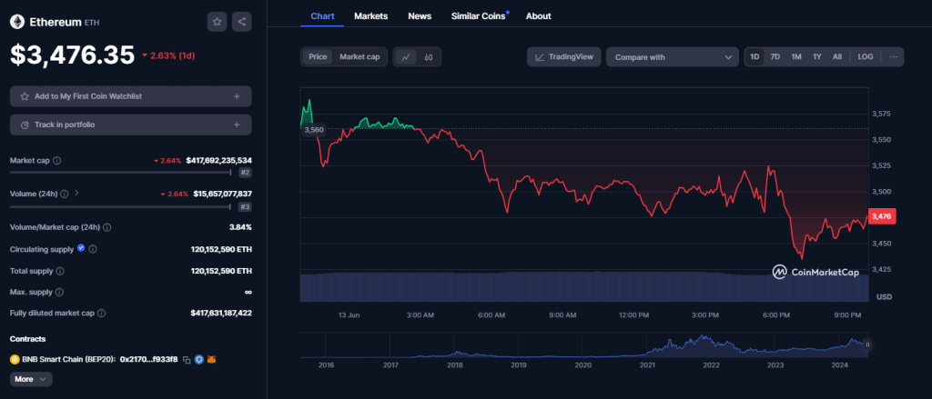 According to fresh data from CoinMarketCap, Ethereum has suffered a notable drop in the last 24 hours. Per the data, the coin is currently trading at $3,475, representing a 2.48% decline within the recorded time. In hindsight, ETH has lost about 9.28% in the last seven days but has significantly increased by 18.06% in the last 30 days.