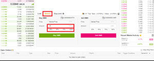 We are going to use the Market option. So input the amount of cryptocurrency you would like to purchase. In our example, we entered 25 XMR. You can also use a percentage of Binance balance if you want. For instance, if you initially funded your Binance account with 0.05 ETH; you can decide to use 25%, 75% or 100% of this balance to purchase the XRM.
