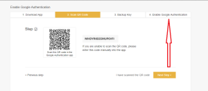 Another pop up will display on your screen asking you to enable the 2FA for your account. This is an extra security feature to keep your account safe. You can skip this step, but we strongly encourage you to complete it before proceeding. You can either use Google Authenticator or SMS Authentication. If you decide to use Google Authenticator, then you have to install the Google Authenticator app to be able to scan the QR or preferably enter the secret key. After that, you will receive a google code which changes every minute.