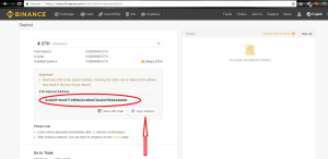 In our example, we want to deposit Ethereum (ETH). A wallet address will be generated automatically. This is the address you will send your ETH to or whatever cryptocurrency you selected. Any cryptocurrency that is sent to this address will appear on your Binance account.