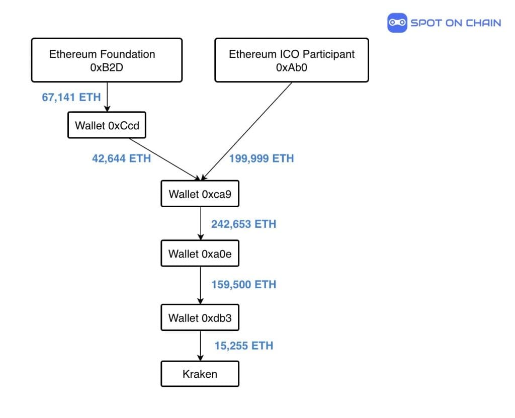 Notably, the first wallet, labeled as ‘0xdb3’ offloaded 2,631 ETH, valued at $9.01 million to the aforementioned exchange. Interestingly, this wallet initially received the ETH from the Ethereum Foundation and the Ethereum Initial Coin Offering (ICO) which happened from July 22 to September 2, 2014, from the participant ‘0xAb0.’ Also, Spotonchain pointed out that this entity has deposited a total of 17,886 ETH, worth $65 million, to the centralized exchange since June 8.
